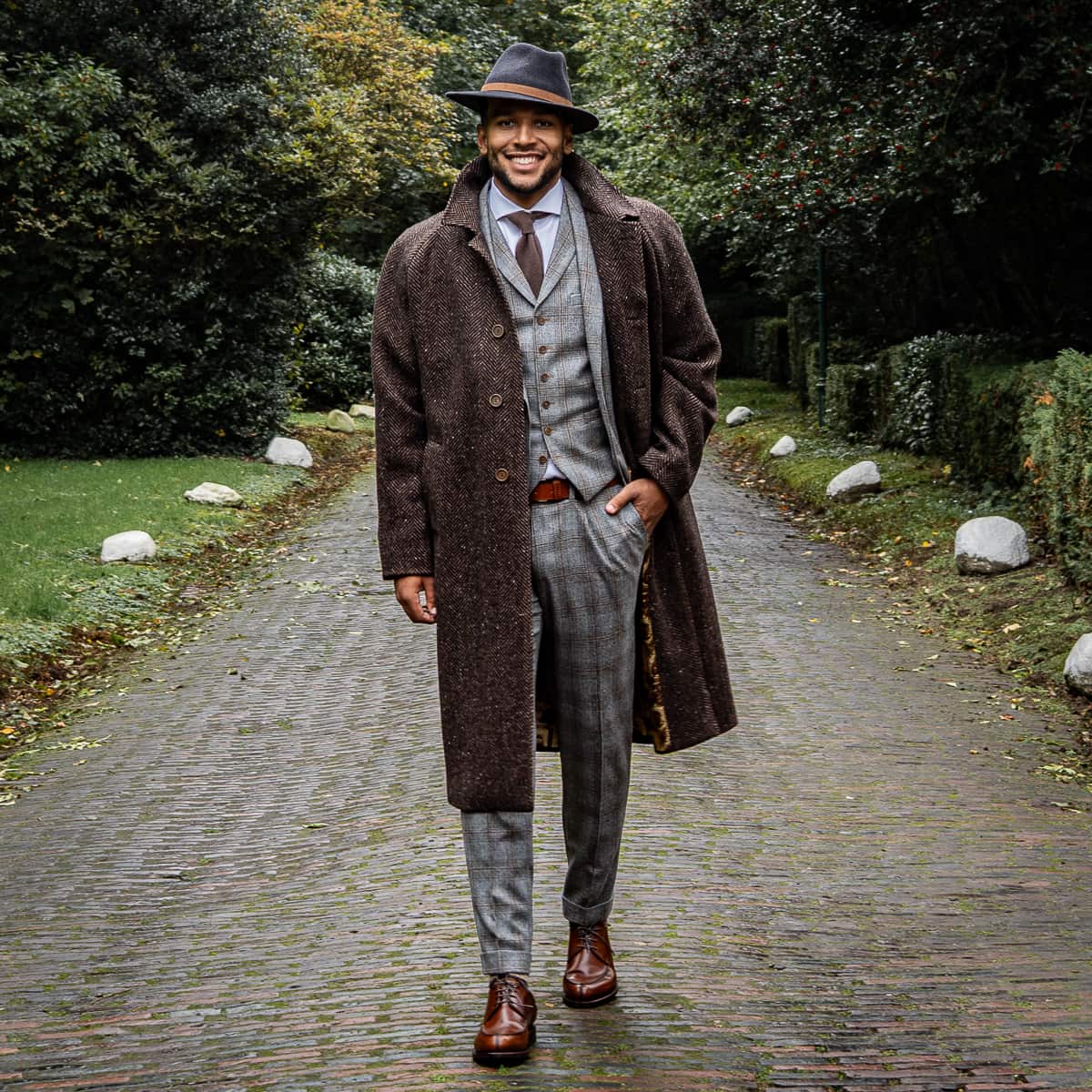 Hochwertiger Raglan-Mantel von 1973 aus schwerer Herringbone-Wolle (530 g), gefertigt aus 100 % Schurwolle. Das klassische Fischgrätmuster in Braun-Schwarz verleiht dem Mantel eine markante Textur und maskuline Eleganz. Innen überrascht der Mantel mit einem humorvollen Kontrastfutter, das mit Vintage-Tierporträts bedruckt ist – ein unverwechselbares Detail der Marke. Der Schnitt ist gerade und komfortabel, mit Raglanärmeln für maximale Bewegungsfreiheit und einer verdeckten Knopfleiste. Das Ärmel- und Rumpffutter aus glatter Viskose sorgt für hohen Tragekomfort auch bei mehrlagigem Styling.
