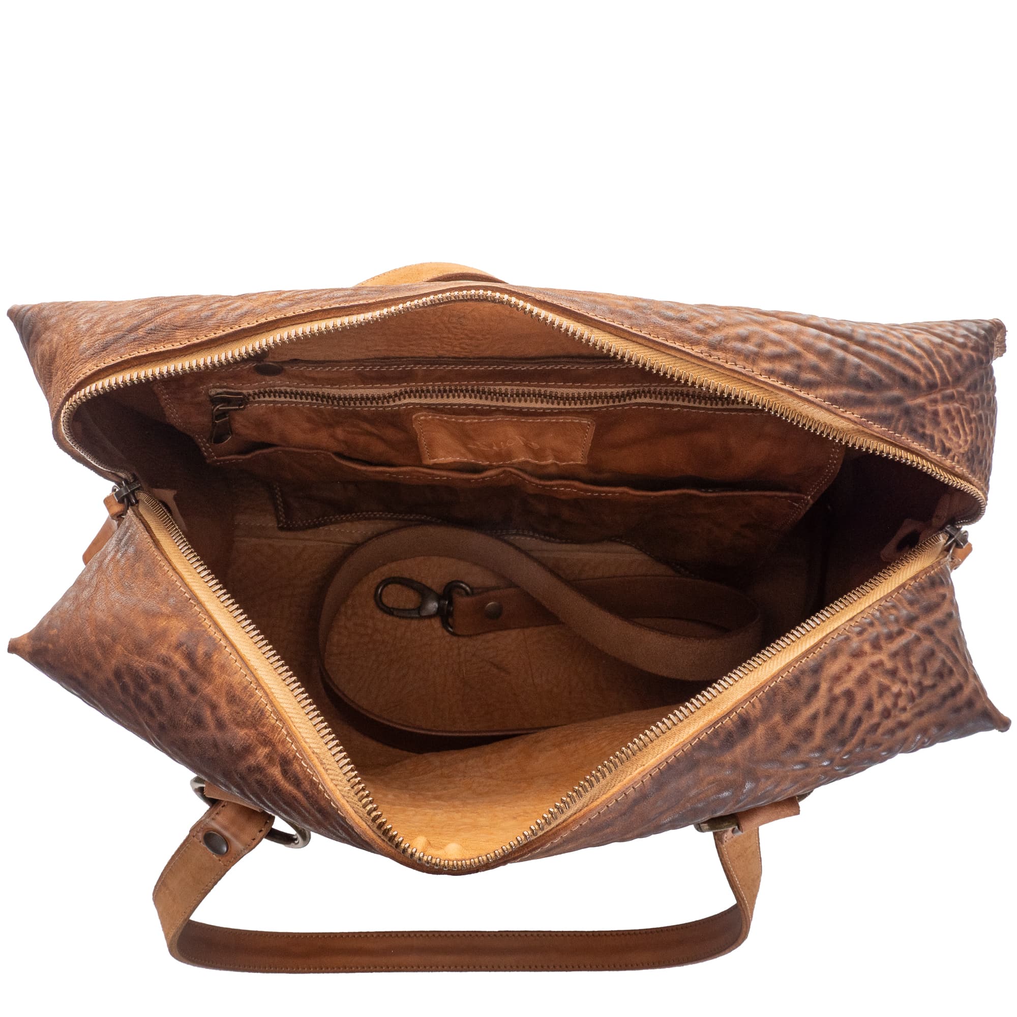 Innen bietet die Tasche viel Platz und ist zudem mit zwei seitlichen Innentaschen ausgestattet. Dank der großzügigen Öffnung mit Reißverschluss lässt sich die Tasche einfach befüllen. Der Schulterriemen ist über einen Verschluss abnehmbar. Von Innen ist die Tasche mit Kalbsleder gefüttert.