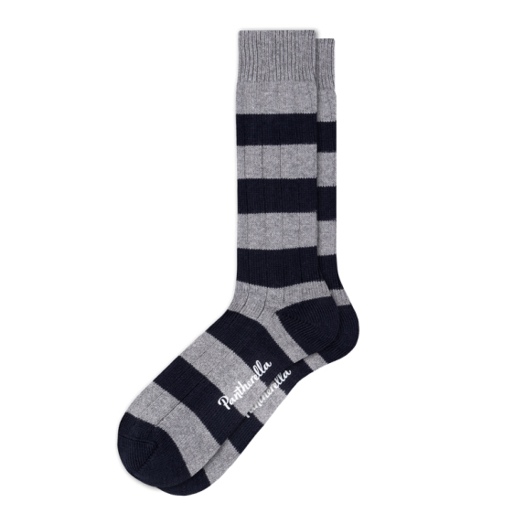 Scott Nichol und Pantherella fertigen in ihrer Weberei in Leicester seit 1937 Socken und Strümpfe aus den feinsten Wollen und Garnen weltweit. Scott Nichol ist die sportliche und junge Linie von Pantherella, führt die bewährten Methoden und den Anspruch an höchste Materialqualität fort. Die soften Rippstrick Socken aus der Cambridge Kollektion mit den klassischen Rugby streifen in verschiedenen Farbkombinationen, sind leicht im Gewicht, von Hand gekettelt, hautschonend und temperaturausgleichend.
